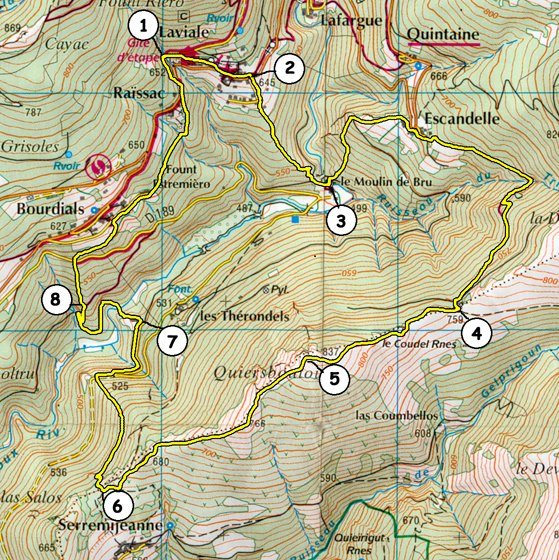 8 Quitter la piste à gauche pour un sentier qui grimpe rapidement pleine pente. Il atteint la D189. Prendre en face le dernier raidillon jusqu'à la voie goudronnée du hameau de Bourdials. La suivre à droite, passer devant Fount Estrémiero et, au bout du goudron poursuivre tout droit par le sentier en sous-bois ; il passe sous le hameau de Raissac et débouche sur la D9, juste avant la montée au parking de Cayac.